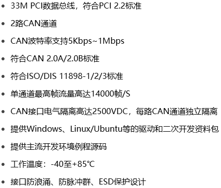 LPCI-252通用型PCI接口CAN卡,具有2路 CAN通道和一路PCI接口,插到电脑的PCI卡槽上,快速扩展出2路CAN通道。CAN接口采用金升阳电源模块和信号隔离芯片实现2500V DC电气隔离,USB接口ESD静电防护;具有优秀的EMC性能,可靠性测试项目:ESD接触放电8KV、浪涌±1KV、脉冲群±2KV。配套测试软件LCANTest使用,接收、发送、分析、记录、回放CAN报文;配套丰富驱动;配套包含库函数、库函数调用说明和丰富例程的二次开发资料包;提供全程专家指导服务。